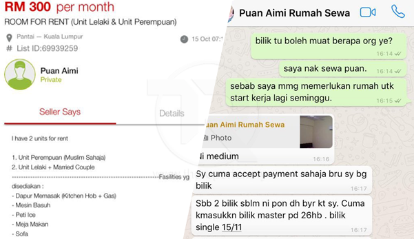 Syakirah Latif yang memuat naik kronologi kejadian itu di Twitternya berkata, dia menemui iklan bilik sewa RM300 itu di laman Mudah.my, yang diiklankan oleh individu bernama Puan Aimi.
