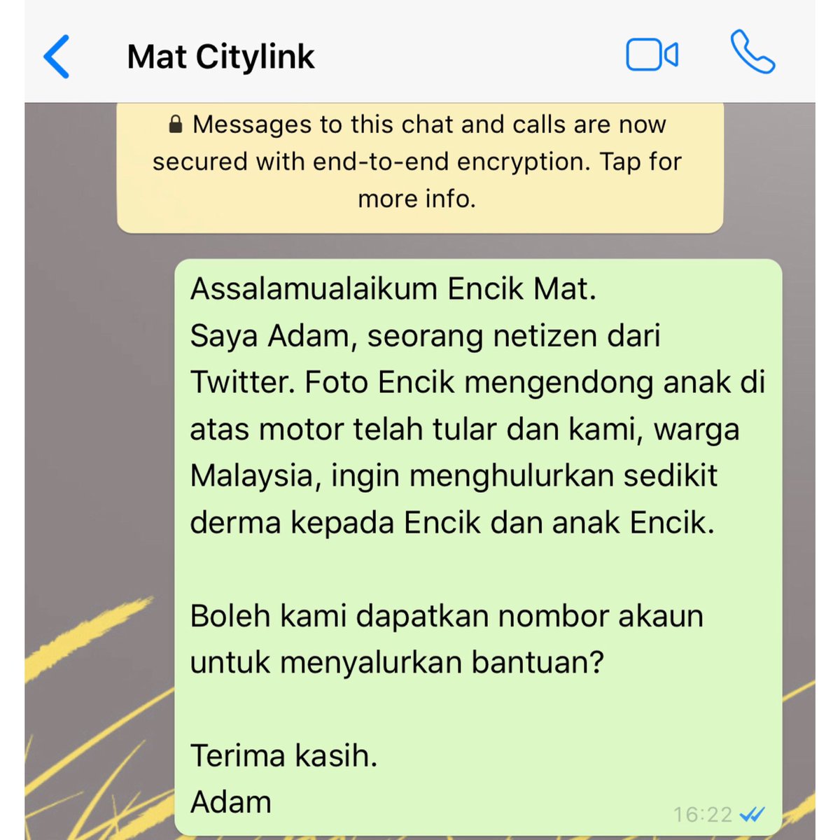 Adam kemudian menghubungi Muhammad Ikhram Ahmad dan mahu menyalurkan bantuan kepadanya.